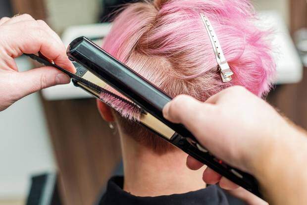 • Comb the hairs forward with a fine-toothed comb, draw a side parting. Now use the straightening iron: First use the lowest setting of the straightening iron. That way you will do the least damage to your hair. Later you can always turn it hotter if necessary. The straightening iron needs about one minute to heat up. Place the straightening iron at the hairline and pull it through your hair strand by strand until it reaches the ends. Be careful not to stay in one position or the hair will get too hot at that point.