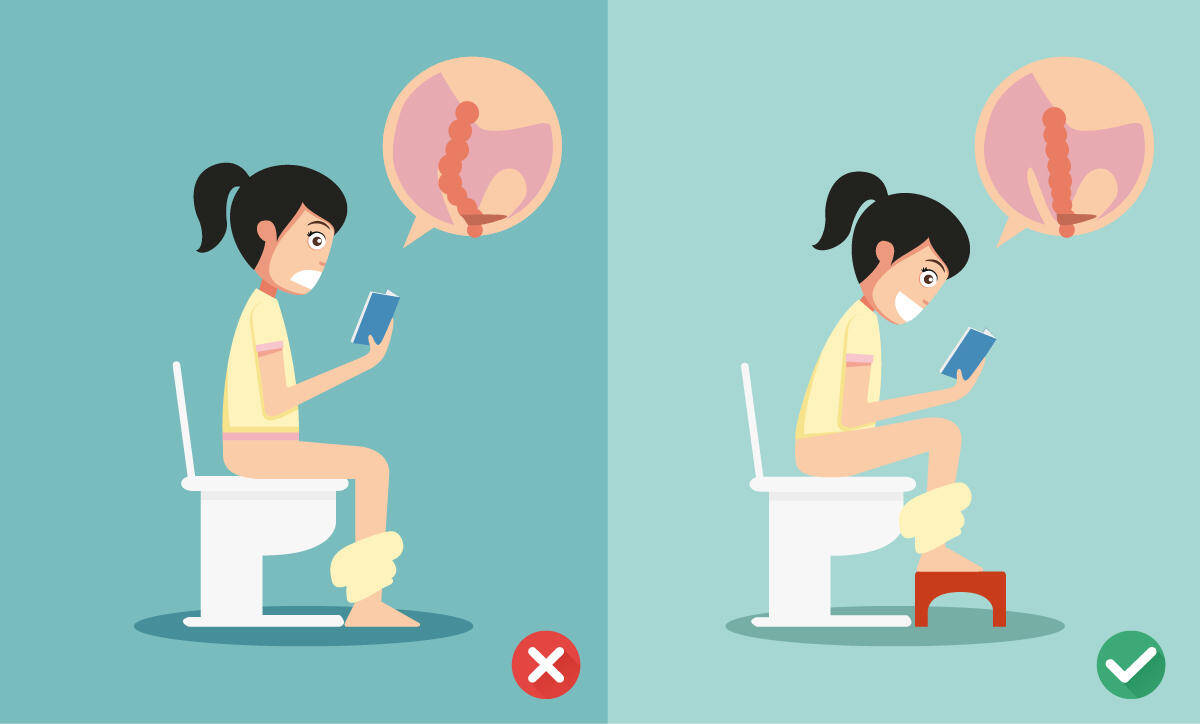 Instead of sitting upright on the toilet, we should sit on it. This relieves the abdominal muscles and brings the intestines into a better position. As a result, the bowel can empty itself more than twice as fast as when sitting on the toilet. But since we don’t have “squat toilets” in this country with holes in the floor, as is still common in France, we should put ourselves in a squatting position. To do this, slide a stool under our feet and lower our upper body.